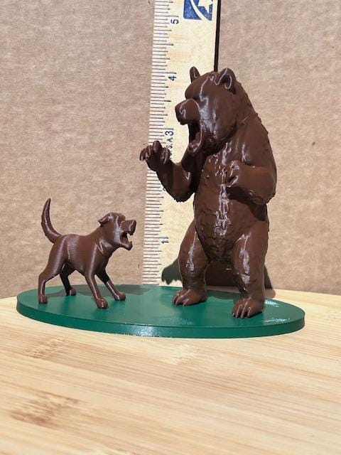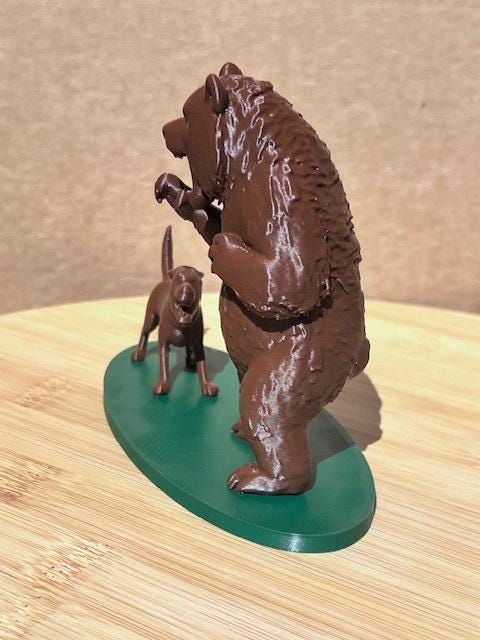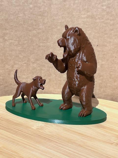 This compelling 3D sculpture freezes a moment of pure, silent confrontation. The bear's mass and raw power are contrasted with the dog's lean alertness and focused intensity. It's a striking piece that explores the duality of nature, capturing the essence of both the wild beast and the domesticated friend in a beautifully detailed and dramatic pose.